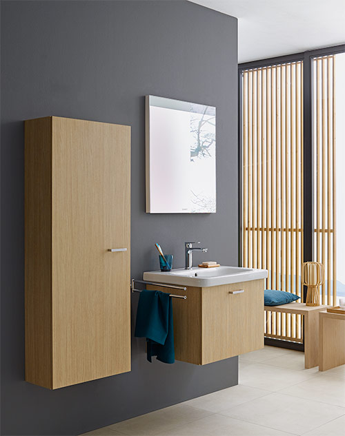 Erhältlich in vier unterschiedlichen Oberflächen in Uni- oder Holztönen bieten die XBase Möbel zahlreiche Möglichkeiten der Badgestaltung. Hinter dem schlichten,aber markanten Griff wartet viel praktischer Stauraum.